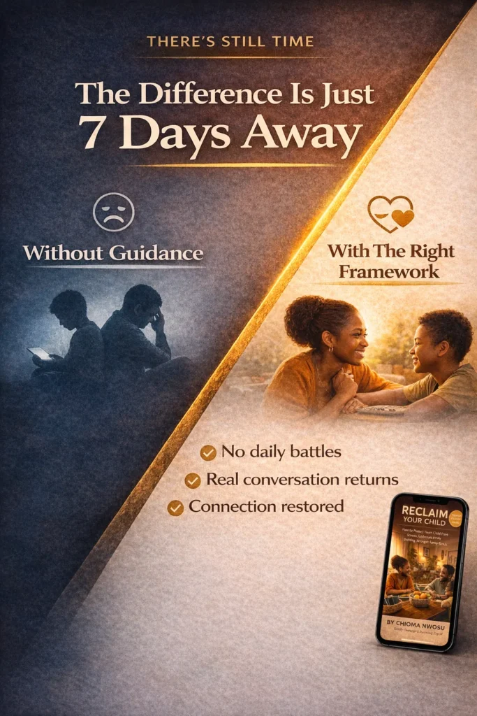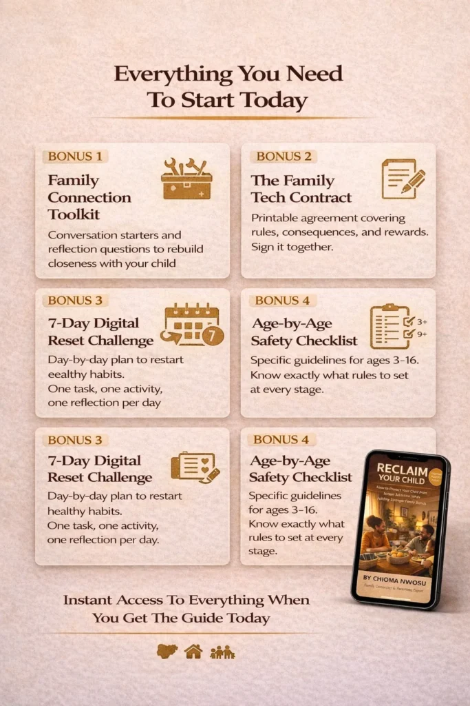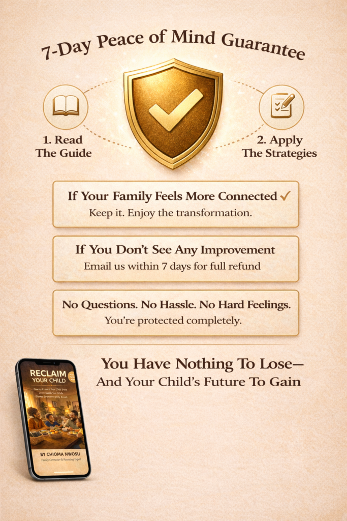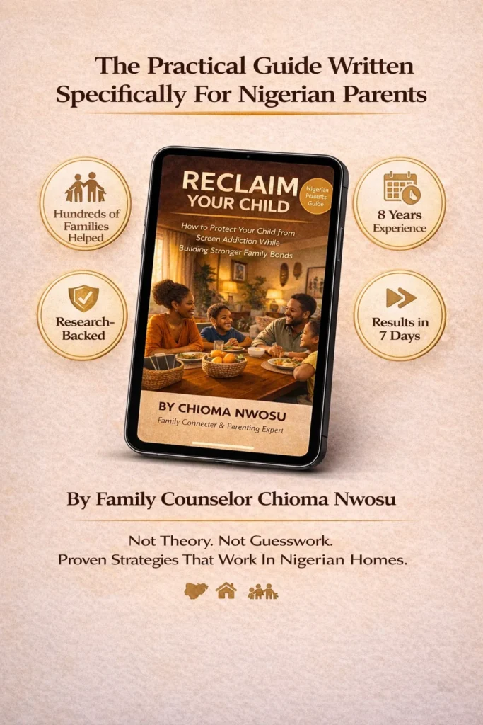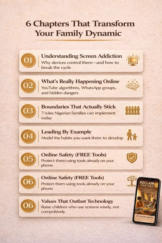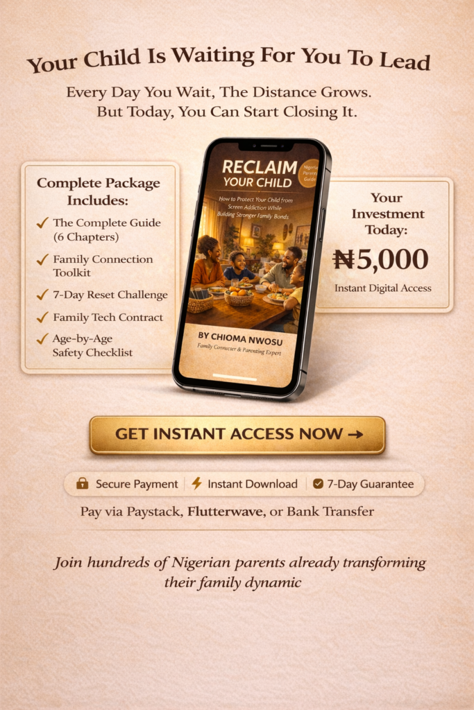 Will this work if I can’t afford expensive parental control apps? Yes. Chapter 5 focuses specifically on FREE tools that work in Nigeria including built-in phone controls, YouTube Kids setup, and WhatsApp privacy settings. You don’t need expensive apps to protect your child.