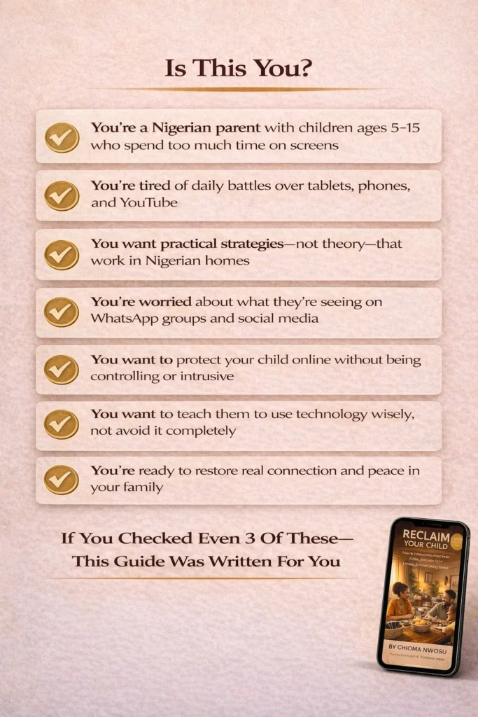 Is this book only for tech-savvy parents? Not at all. This book was written for everyday Nigerian parents, whether you’re comfortable with technology or still learning. The strategies are simple, practical, and don’t require any technical expertise.