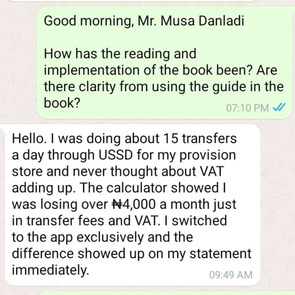 Tab 3: Enter your daily transfer and USSD habits — it shows your monthly VAT leak and how much two simple changes to your banking habits would save you annually. Blue cells are your inputs. Everything else calculates automatically.